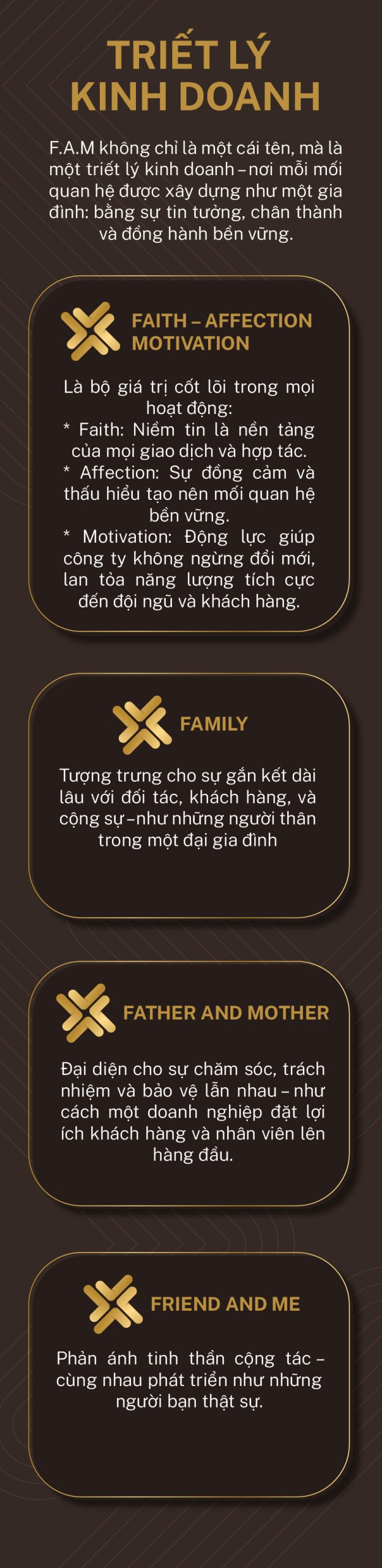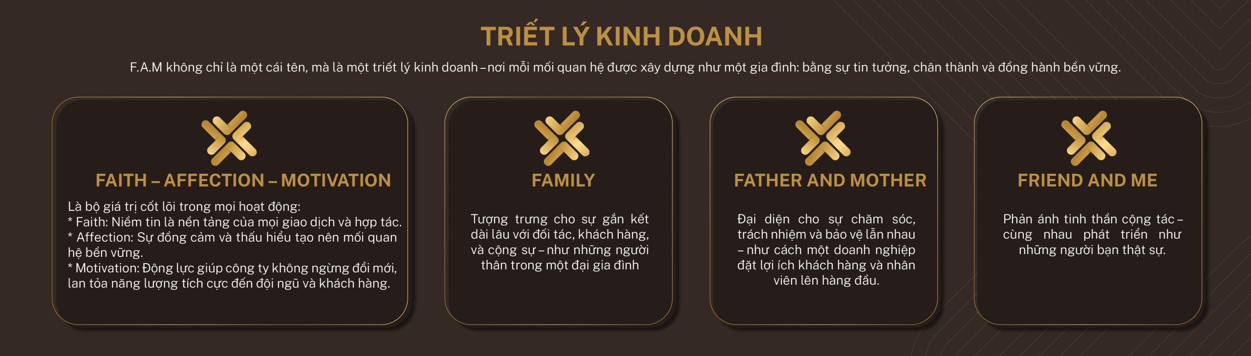 FAM GROUP là hệ sinh thái bất động sản toàn diện, hoạt động từ phát triển dự án, phân phối, marketing – truyền thông, quản lý vận hành đến đào tạo, xây dựng và hợp tác đầu tư. Với triết lý Faith – Affection – Motivation, chúng tôi đặt niềm tin, sự thấu hiểu và động lực làm nền tảng, mang đến giải pháp chuyên nghiệp, gắn kết và bền vững cho khách hàng, đối tác và cộng sự