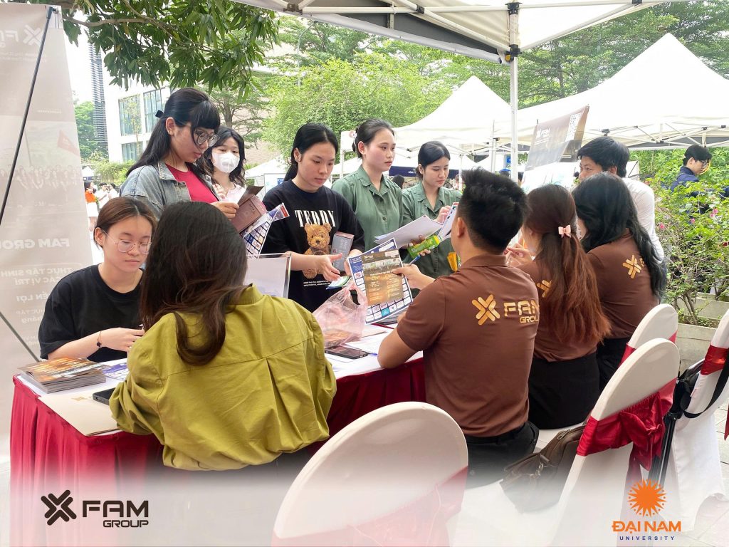 Ngay sau lễ khai mạc, quầy tư vấn tuyển dụng của FAM GROUP đã trở thành tâm điểm thu hút sự quan tâm của đông đảo sinh viên các khối ngành Kinh tế, Marketing và Quản trị. Tại đây, đội ngũ nhân sự của FAM GROUP đã trực tiếp tư vấn, giải đáp thắc mắc về lộ trình nghề nghiệp và mang đến hàng loạt cơ hội việc làm hấp dẫn: